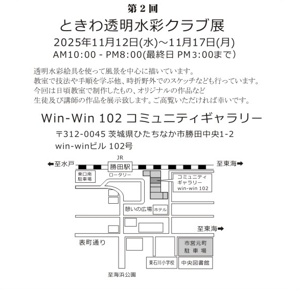 場所はJR勝田駅東口のロータリー脇win-winビル1階 コミュニティギャラリーにて