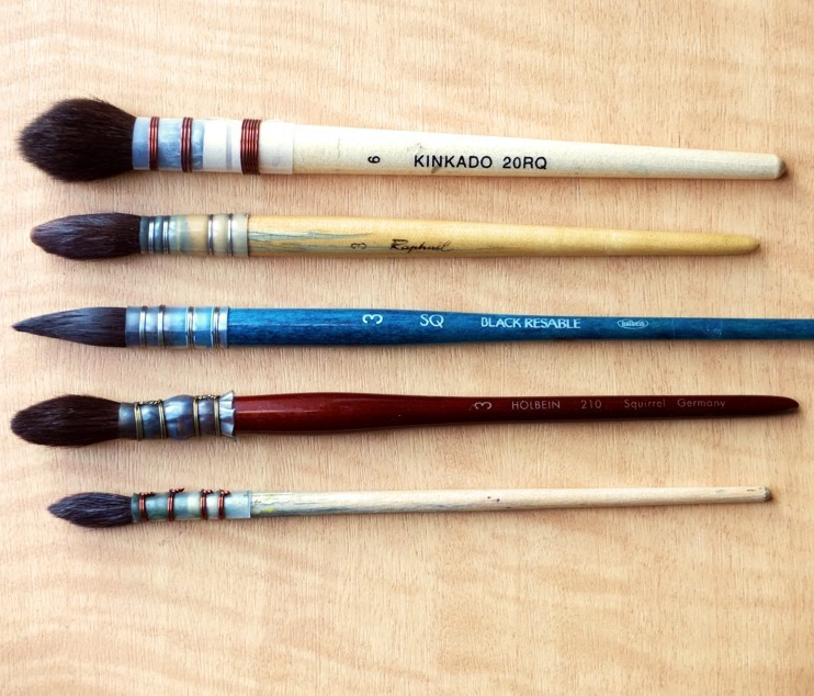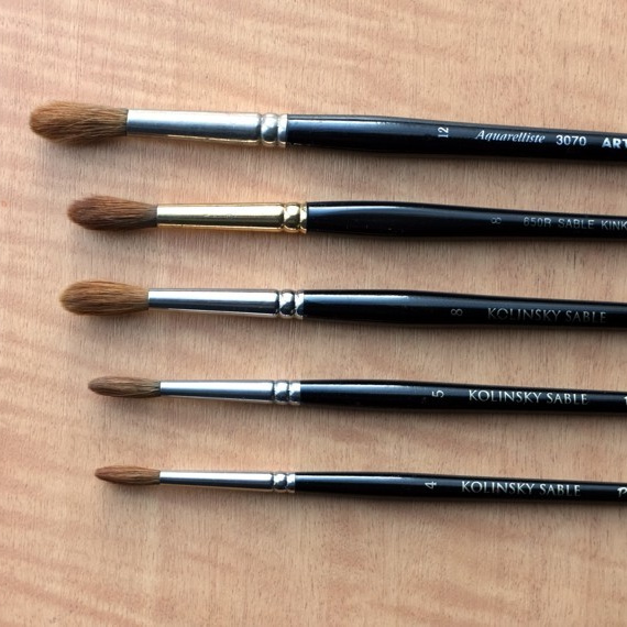 私はテンの毛で作った丸筆でコリンスキー、セーブル筆と呼ばれるものを使用。水の含みが良く、適度な腰があり、穂先もまとまっています。